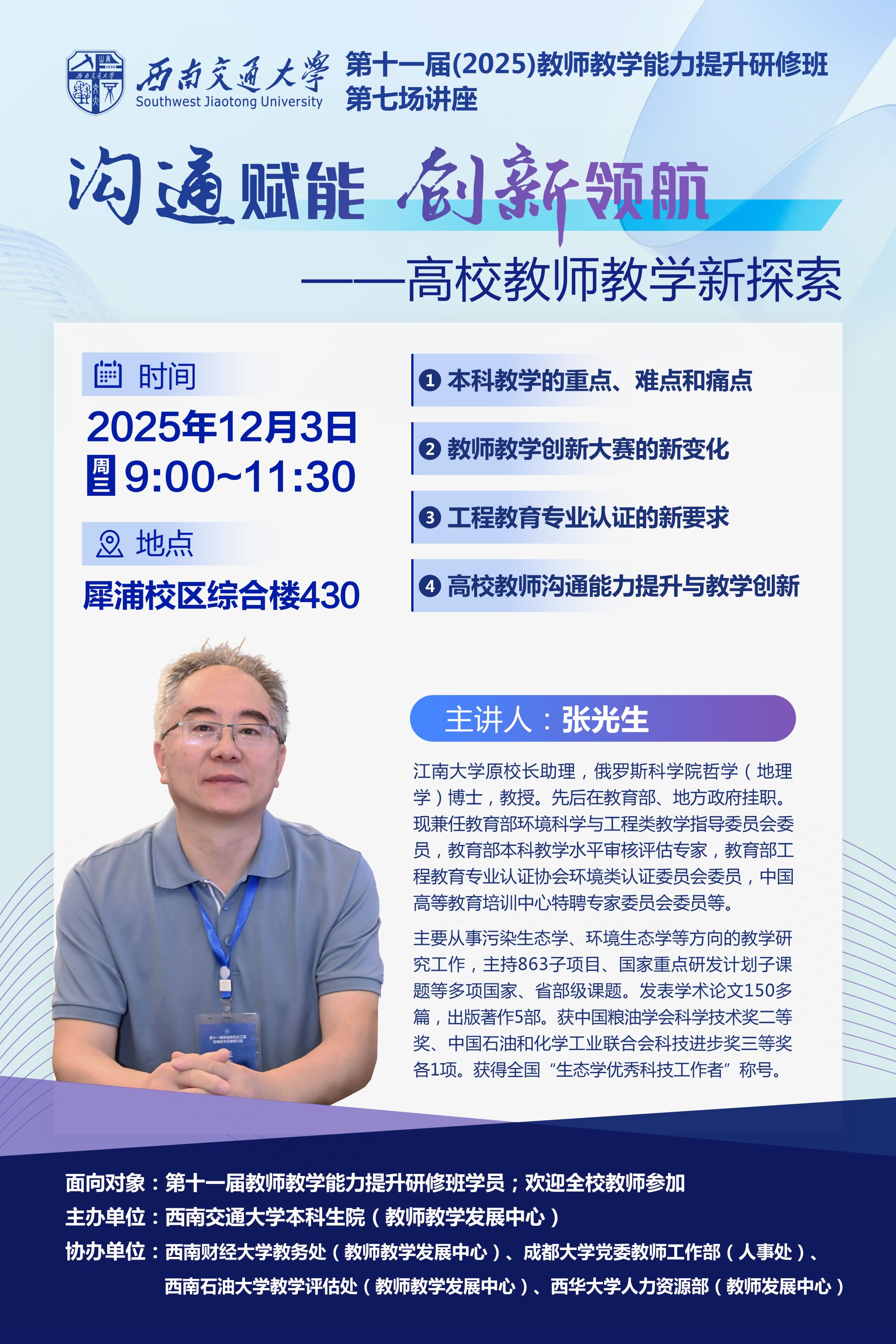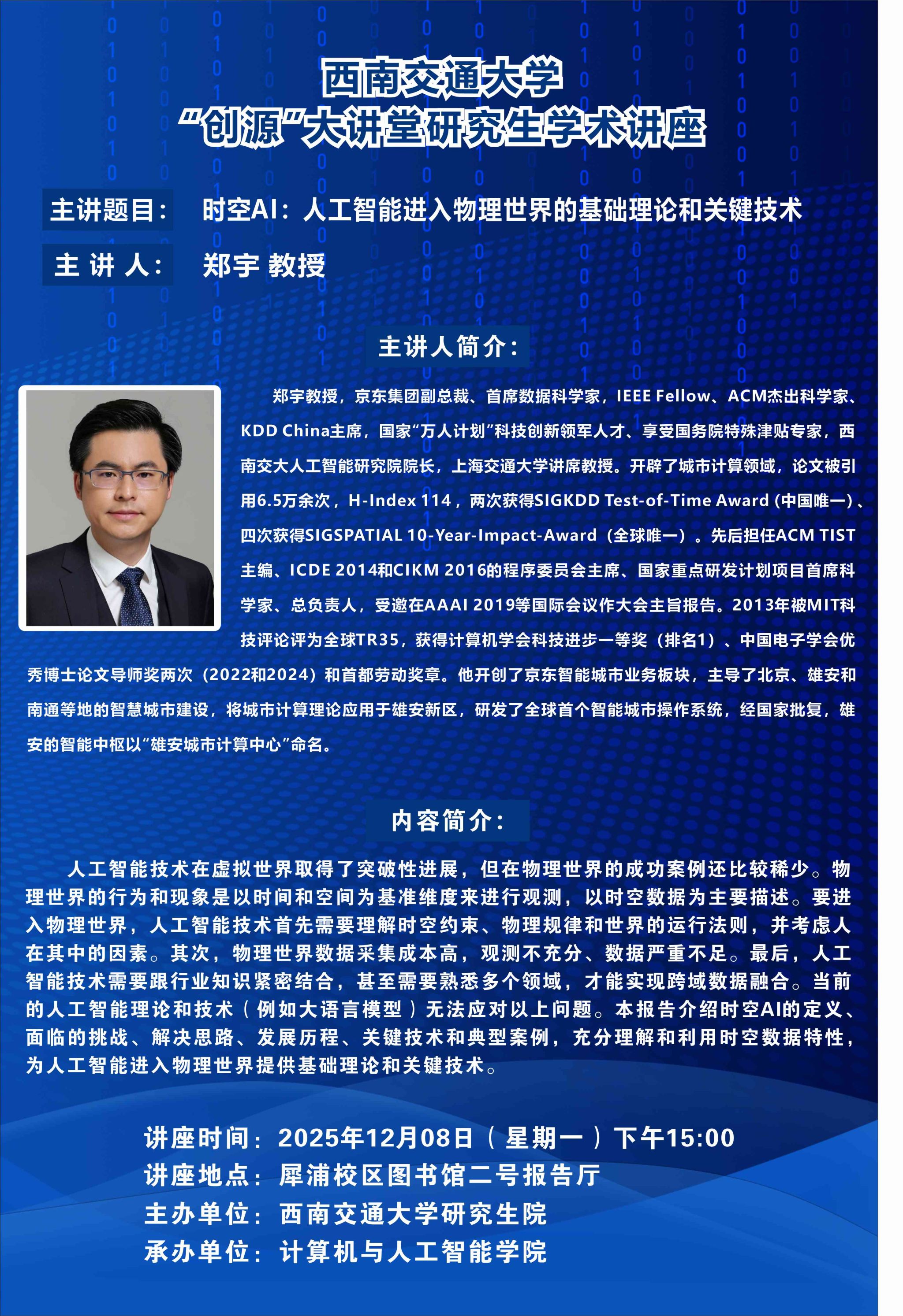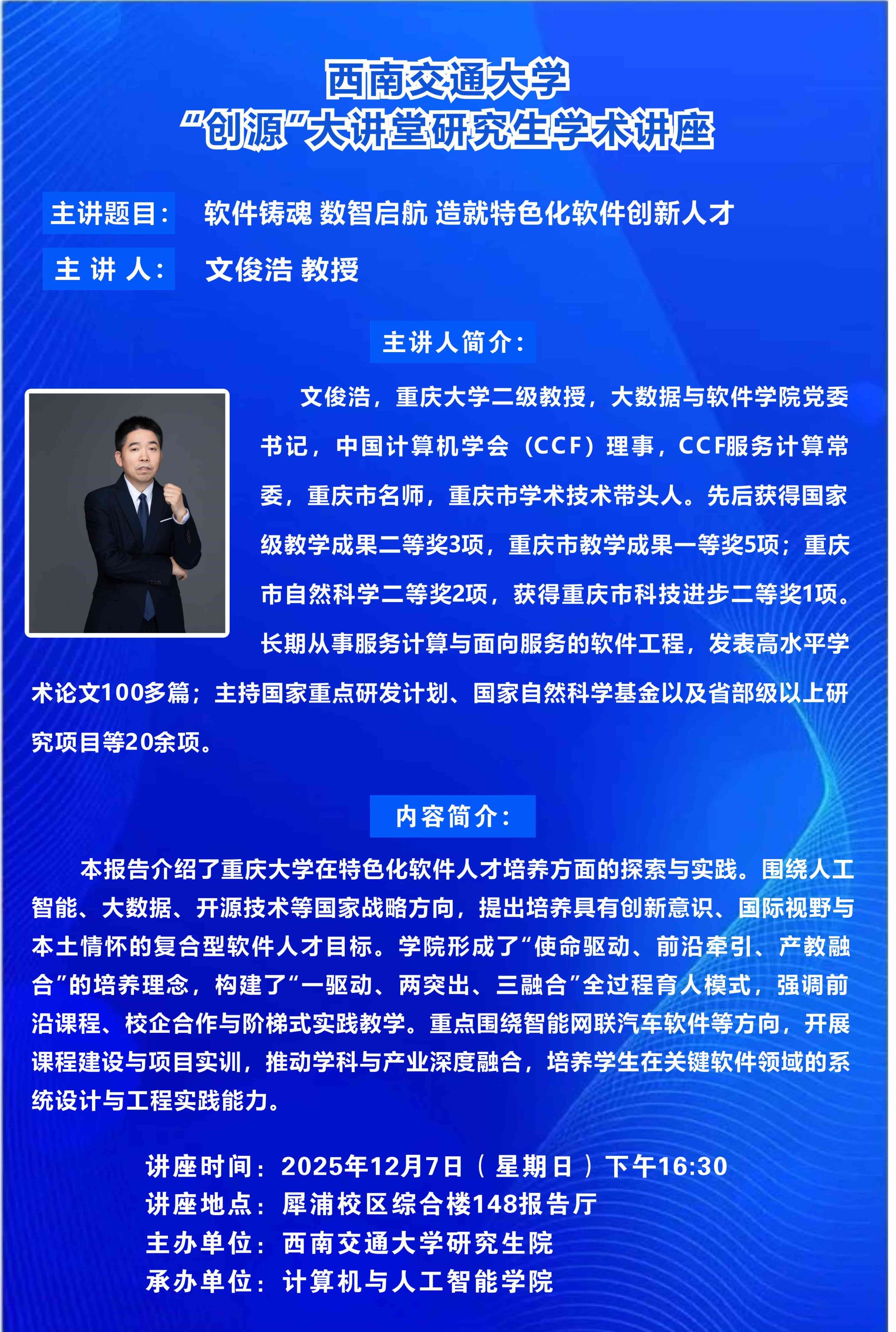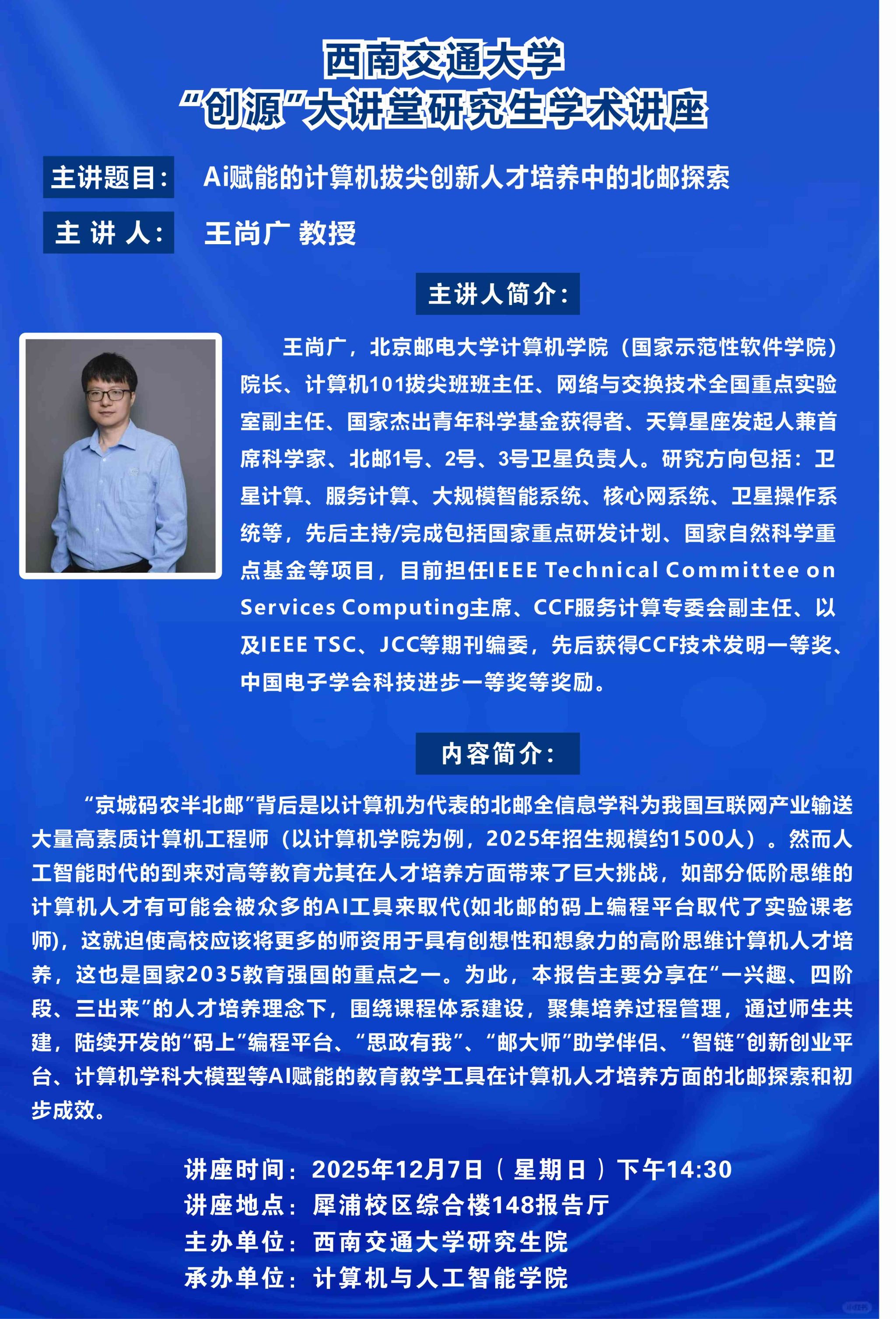 讲座时间:2025年12月7日(星期日)下午15:30讲座地点:犀浦校区综合楼148报告厅主 讲 人:刘譞哲 教授主讲人简介:刘譞哲,北京大学博雅特聘教授,北京大学软件研究所所长,北京大学-字节跳动豆包大模型系统软件联合实验室主任,ACM杰出科学家。主持国家杰出青年科学基金项目在内的20余项科研项目。长期从事系统软件、人工智能、服务计算方面的研究工作。在SOSP、OSDI、NSDI、SIGCOMM、WWW等发表CCF A类论文100余篇,获WWW2019最佳论文奖、TSC 20...