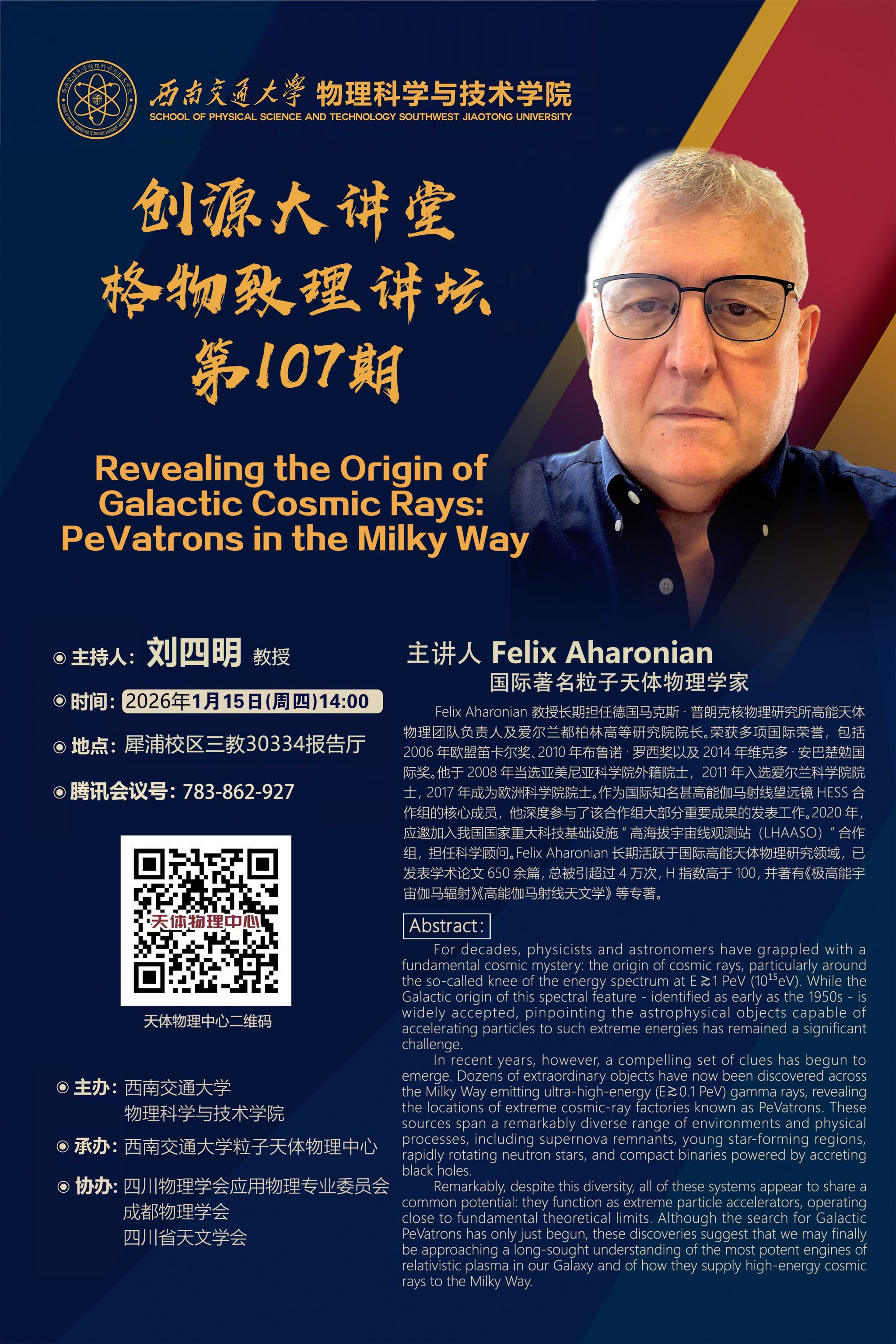 题目:Revealing the Origin of Galactic Cosmic Rays: PeVatrons in the Milky Way主讲人:Felix Aharonian 国际著名粒子天体物理学家时间:2026年1月15日(周四)14:00地点:犀浦校区三教30334报告厅主持人:刘四明 教授简历:Felix Aharonian教授长期担任德国马克斯·普朗克核物理研究所高能天体物理团队负责人及爱尔兰都柏林高等研究院院长。荣获多项国际荣誉,包括2006年欧盟笛卡...