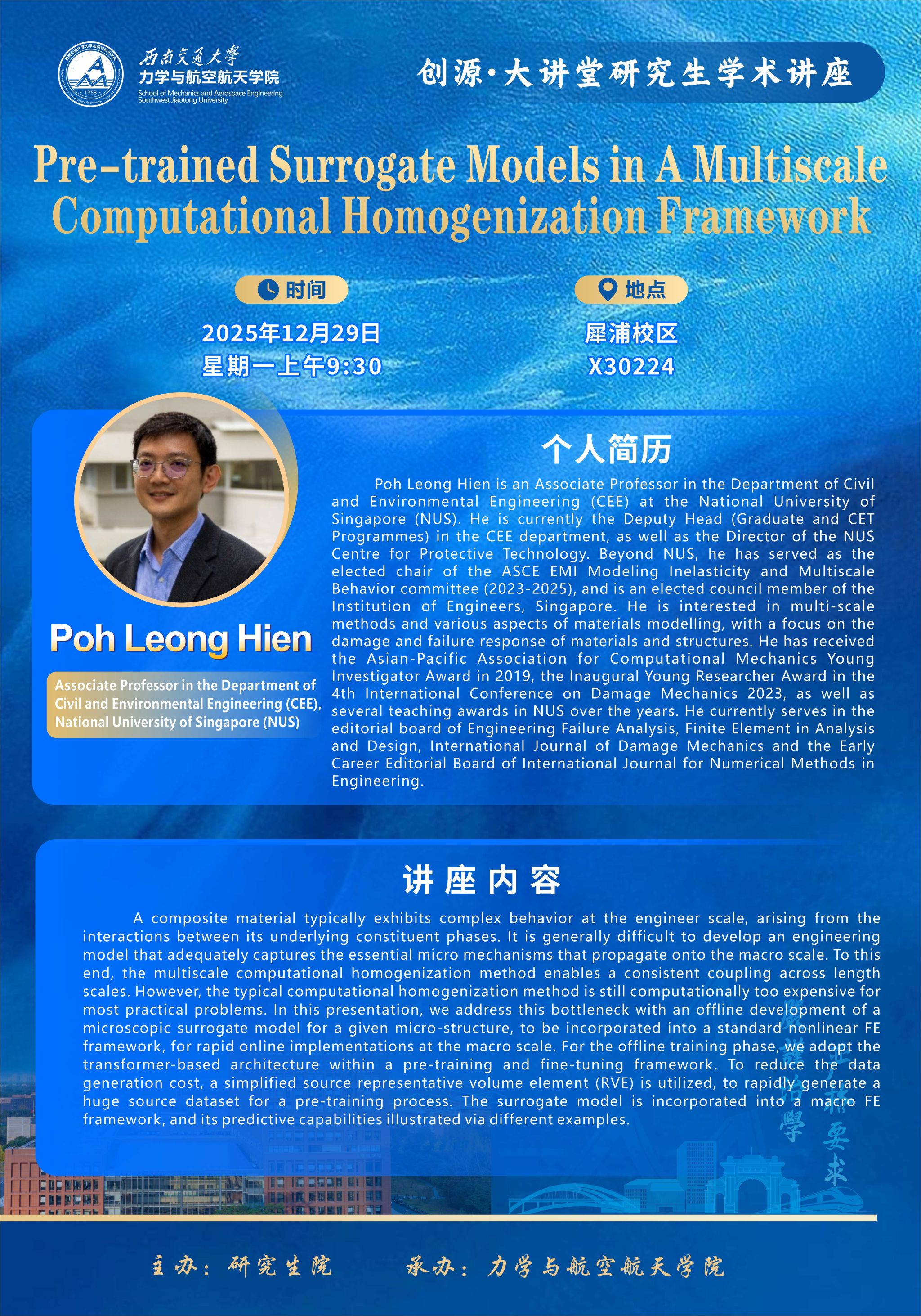 讲座时间:2025年12月29日星期一上午9:30讲座地点:X30224讲座题目:Pre-trained Surrogate Models in A Multiscale Computational Homogenization Framework主 讲 人:Poh Leong Hien个人简介:Poh Leong Hien is an Associate Professor in the Department of Civil and Environmental Engine...