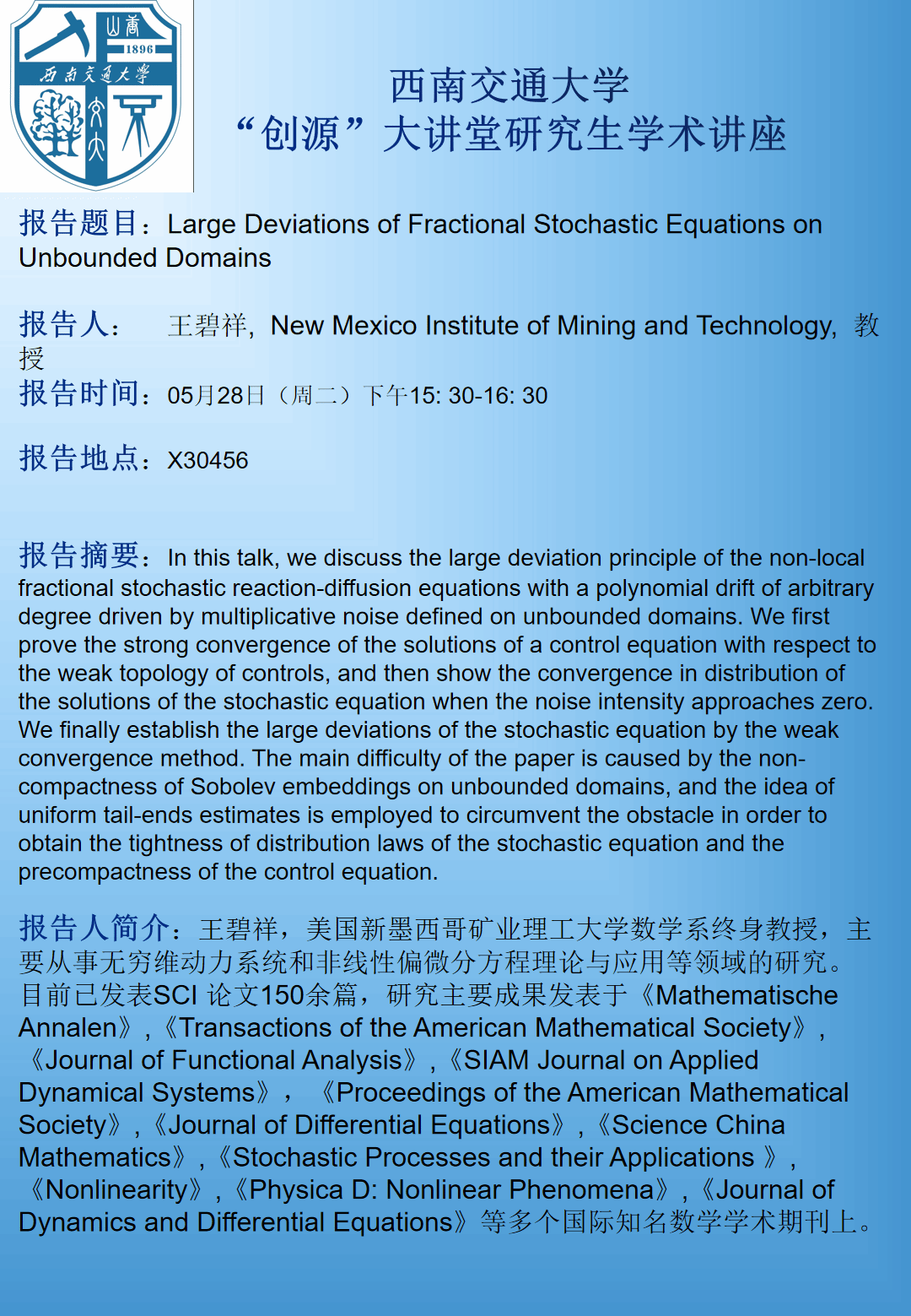 【创源大讲堂】Large Deviations of Fractional Stochastic Equations on Unbounded Domains