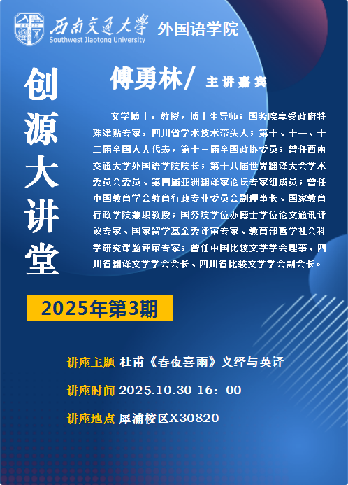 主讲人:傅勇林主讲人介绍:文学博士,教授,博士生导师;国务院享受政府特殊津贴专家,四川省学术技术带头人;第十、十一、十二届全国人大代表,第十三届全国政协委员;曾任西南交通大学外国语学院院长;第十八届世界翻译大会学术委员会委员、第四届亚洲翻译家论坛专家组成员;曾任中国教育学会教育行政专业委员会副理事长、国家教育行政学院兼职教授;国务院学位办博士学位论文通讯评议专家、国家留学基金委评审专家、教育部哲学社会科学研究课题评审专家;曾任中国比较文学学会理事、四川省翻译文学学会会长、四川省...